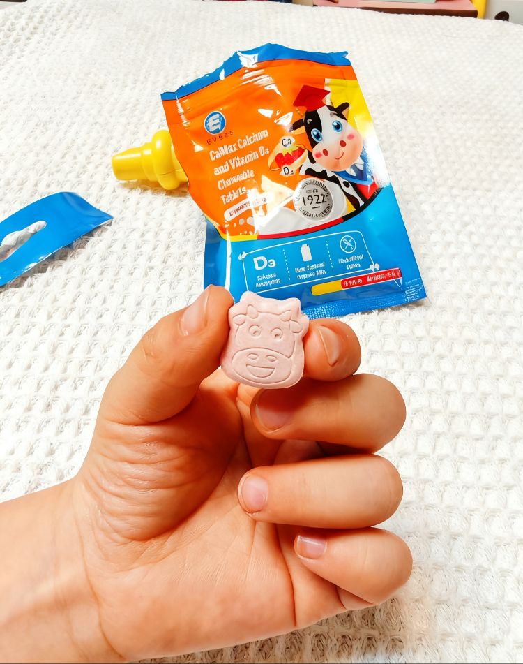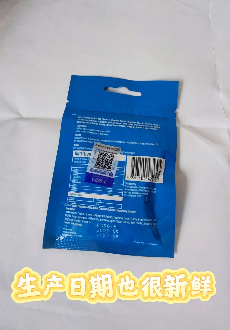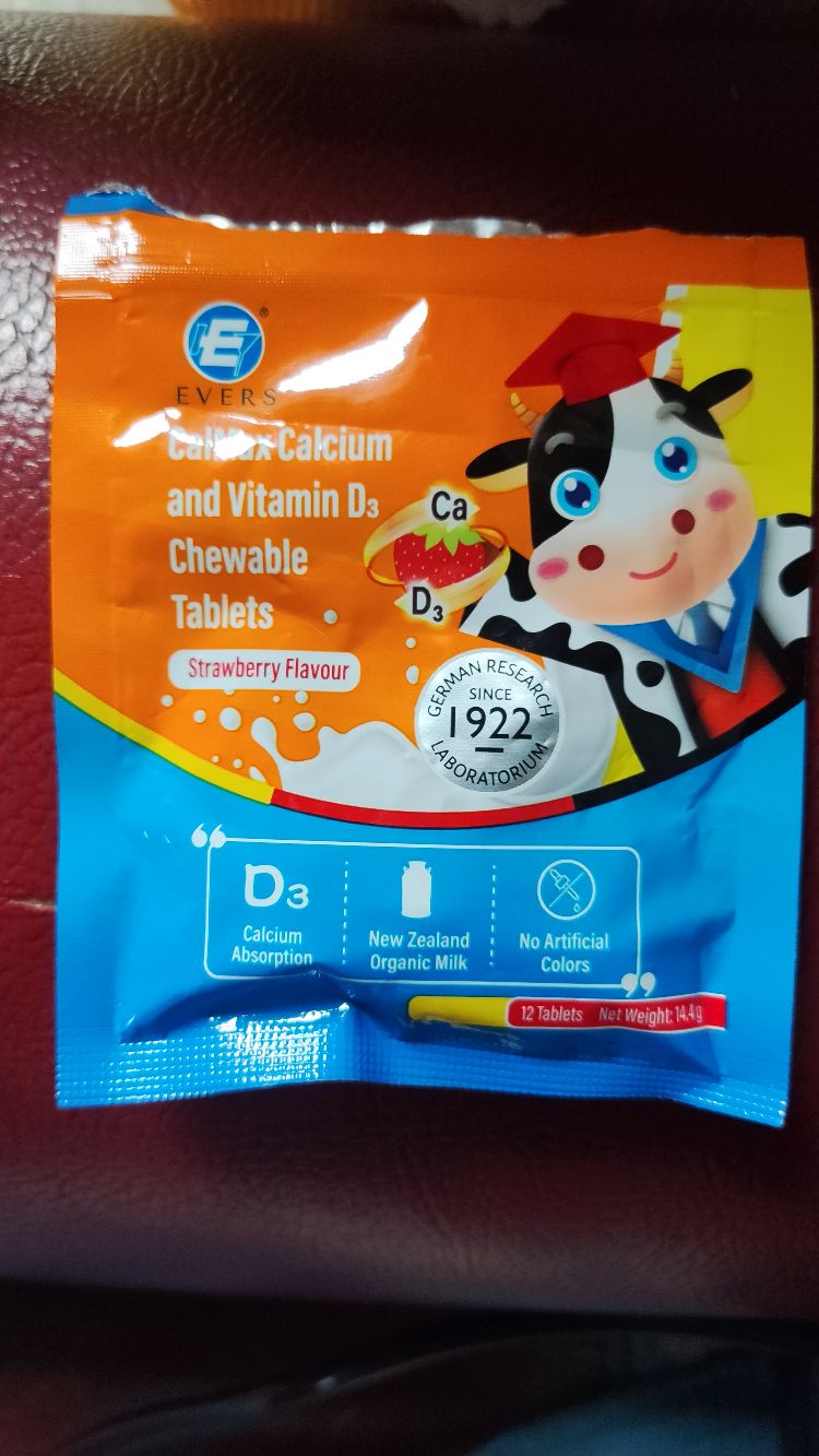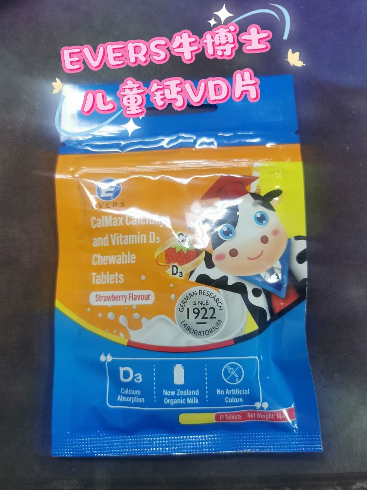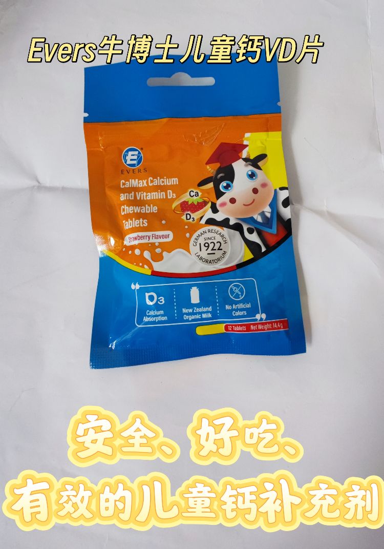 当我第一次把Evers牛博士儿童钙VD片递给孩子时,蓝色主色调,正面印有卡通牛博士形象,包装上清晰标注了“Calcium Absorption”“New Zealand Organic Milk”“No Artificial Colors”等字样。打开包装,...