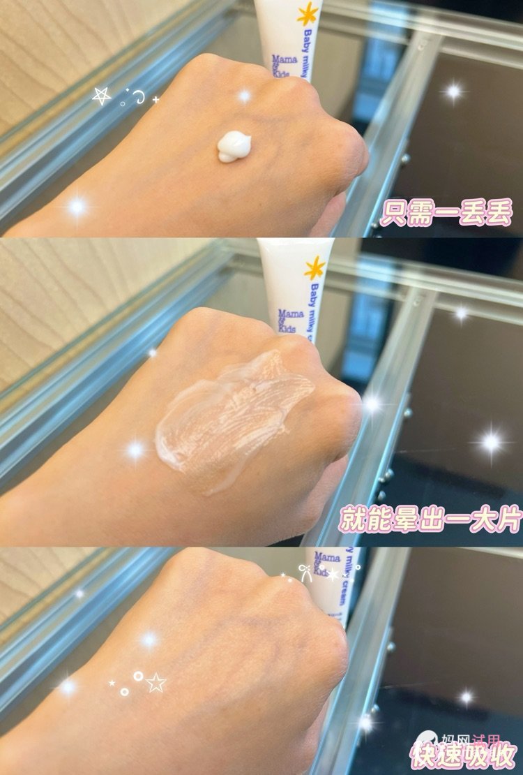 Mama&Kid婴儿滋润乳霜质地滋润不厚重,非常好推开,只需一点就能晕开一整片,延展性很好,非常适合给宝宝搭配手法进行按摩推拿,同时滋润肌肤。